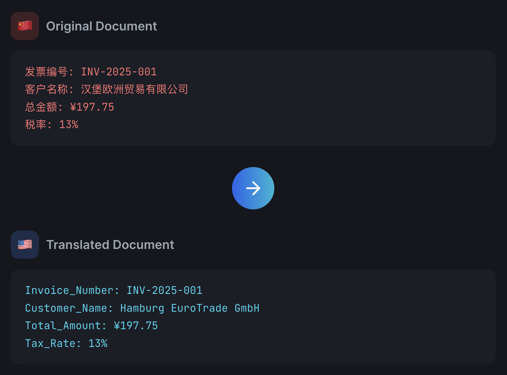 Seamlessly translate documents between languages. Perfect for international supply chains. Maintains data structure while converting field names and values.